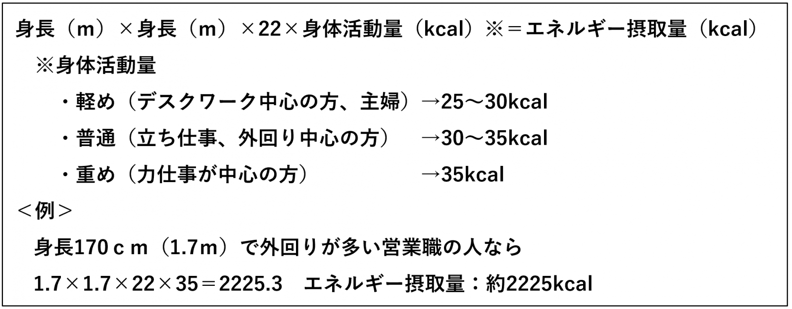 自分のエネルギー摂取量は下記の式で計算することができます!