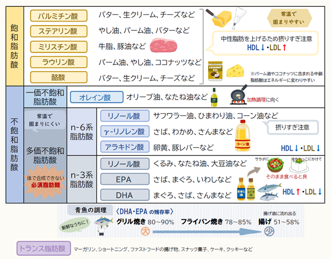 油脂は種類によって含まれる成分が異なってくるので、量だけでなく種類にも注意することが大切です。油脂には常温で固体の「飽和脂肪酸」と常温で液体の「不飽和脂肪酸」があります。どちらも体に必要ですが、バランスよくとることが大切です。