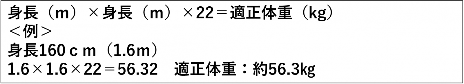 適正な体重は下記の式で計算できるので、自分の数値を知っておきましょう。