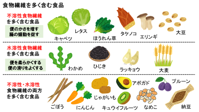 緑黄色野菜を含めた野菜、海藻、大豆および大豆製品から食物繊維をしっかり摂取することで、血中脂質は改善され、心血管疾患や脳血管疾患の発症リスク・死亡リスクが低くなります。野菜は1日に350g以上必要です。しかし、漬物などを食べる際は、同時に食塩の摂取が多くならないように注意が必要です。精製度の低い五分づき米や玄米などは、食物繊維がしっしかり摂取できるだけでなく、ビタミンB1やマグネシウムなどの他の栄養素も摂取できるので、推奨されています。