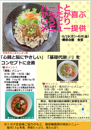 | 第14位:生活習慣病 | ⑱適塩メニューを企画し、食堂で提供 ・当組合HPの「高血圧」ページをポップ掲示、メール展開などで紹介。 ◆「高血圧」(トヨタ健保HP)  | 0円 |