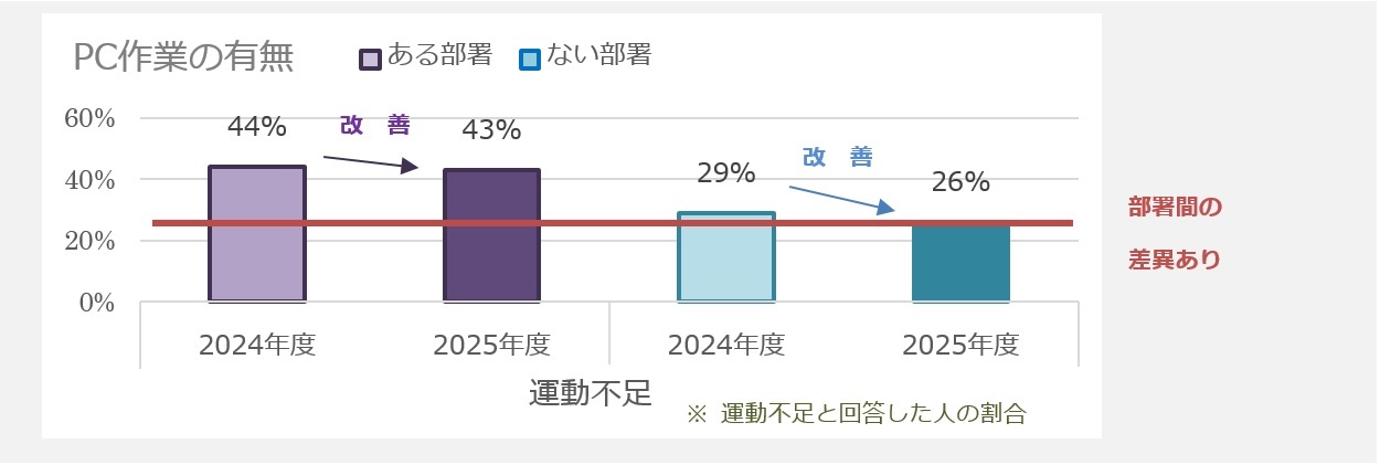 2025年4月に座り過ぎ防止対策としてサービスが開始された飲料自販機に連動の健康増進アプリの新機能(自販機で3時間に1回出来る「すごろく」※事務所の1階上に設置の自販機まで歩く)の利用推奨を行いました。また、ウォーキング大会の開催回数を増やしています。(2024年度:2回/年→2025年度:3回/年(予定)。なお、1位の「身体のだるさ」についても、同様の部署別の確認を行ったところ部署の差異はありませんでした。「身体のだるさ」については、生活習慣・精神的なストレス・ホルモンの乱れなど様々な原因によって引き起こされるもののため、多角的な対策を講じることで改善を図っています。高たんぱく食摂取の必要性や質の良い睡眠と6時間以上の睡眠時間の確保など、生活習慣に関する情報の提供や心の不調対策として厚労省のポータルサイト「こころの耳」のeラーニングを実施するなど様々な施策を実施しています。