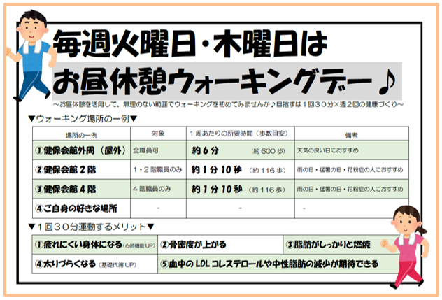 | 第4位:運動不足 <運動不足になっている背景> 仕事、家事、育児等で 忙しく運動をする時間が割けない ※職員アンケートより把握 | ①職場にいる時間を活用した運動を推奨 ・週2日のお昼休憩時間をウォーキングデーとして設定 ・就業時間後のヘルスケアエリアの活用を推奨  | 0円 |