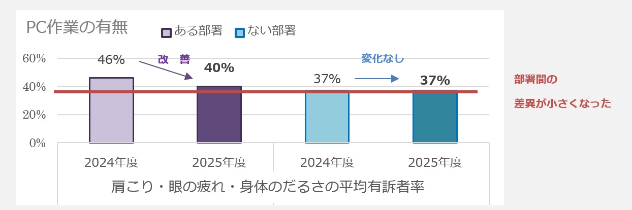2024年度の肩こり有訴者率は、改善傾向にあるものの未だ職員が認識している健康課題2位であったため、引き続き対策を行っています。また、「眼の疲れ」が8位から3位、となり、PC作業の影響によるものではないかという仮説を立て、PC作業のある部署とない部署に分けて確認を行ったところ、PC作業のある部署の方が0.4ポイントも高い数値となりました。よって、PC作業のある部署を中心に眼精疲労対策を強化しました。講師を招き、肩こり・眼精疲労解消セミナーを実施しました。